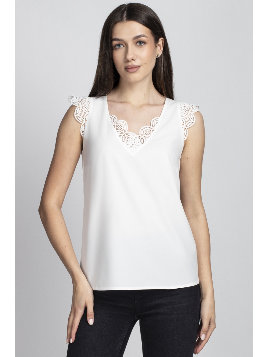 Горловина V-образной формы с отделкой из кружева.