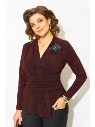 Эффектная нарядная блузка, выполнена из мягкого трикотажа с мерцающим эффектом. Такой дизайн ткани придает необычное переплетение нитей: с изнанки мягкий однотонный трикотаж! Вырез горловины мягкая стойка, переходящая в V-образный вырез с имитацией запаха. По полочке заложены декоративные складки для комфортного прилегания изделия. Низ блузки ассиметричный. Пояс декорирован задрапированным поясом из основной ткани, что зрительно стройнит и скрывает все недостатки фигуры. Рукав в точной, длинный. Спинка приталенная, без особенностей.