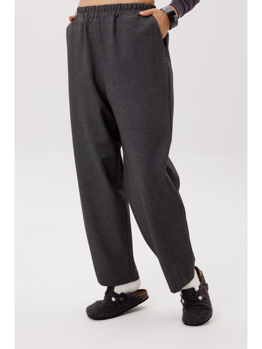 Идея повседневной элегантности обретает здесь свою совершенную форму — мягкий трикотаж, струящийся свободным кроем, нежно обволакивает фигуру, даря ей полную раскрепощенность. Высокая посадка становится основой безупречного силуэта, плавно ведущего взгляд от тонко подчеркнутой талии к изящному заужению книзу, созданному изящной вытачкой для идеальной посадки по ноге. Притачной пояс завершает эту гармонию линий, обеспечивая комфорт, который не приходится проверять, а боковые карманы добавляют практичной лаконичности.