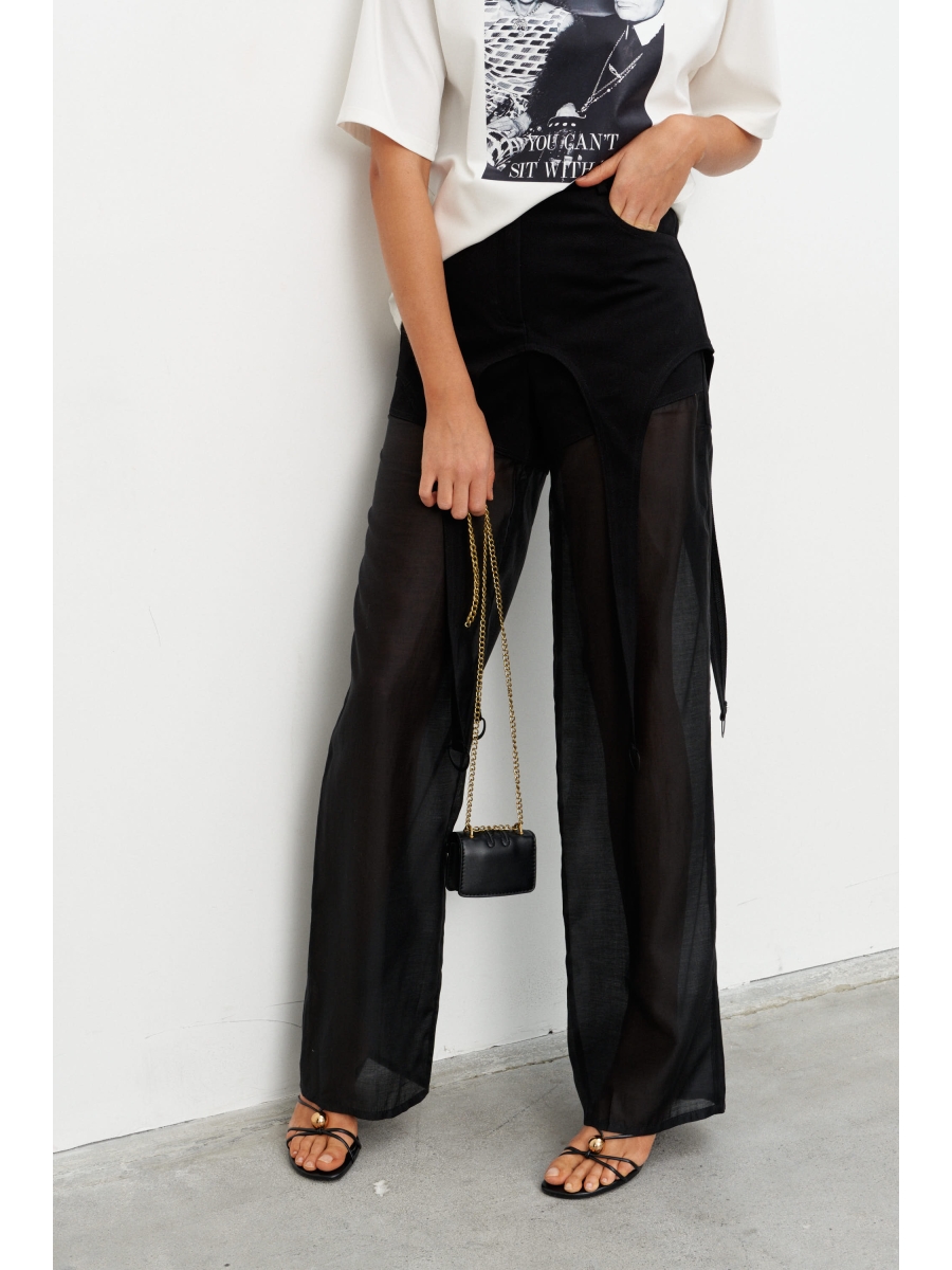 Брюки прямого силуэта с баской выполнены на сочетании плотного джинса и полупрозрачной вискозной вуали. Брюки на поясе со шлёвками и застёжкой на пуговицу-болт и молнию. Чуть ниже шва сидения идут подрезы имитирующие по форме мини-шорты. От подрезов вниз брюки выполнены из вуали. По переду два прорезных кармана, по спинке - два накладных.