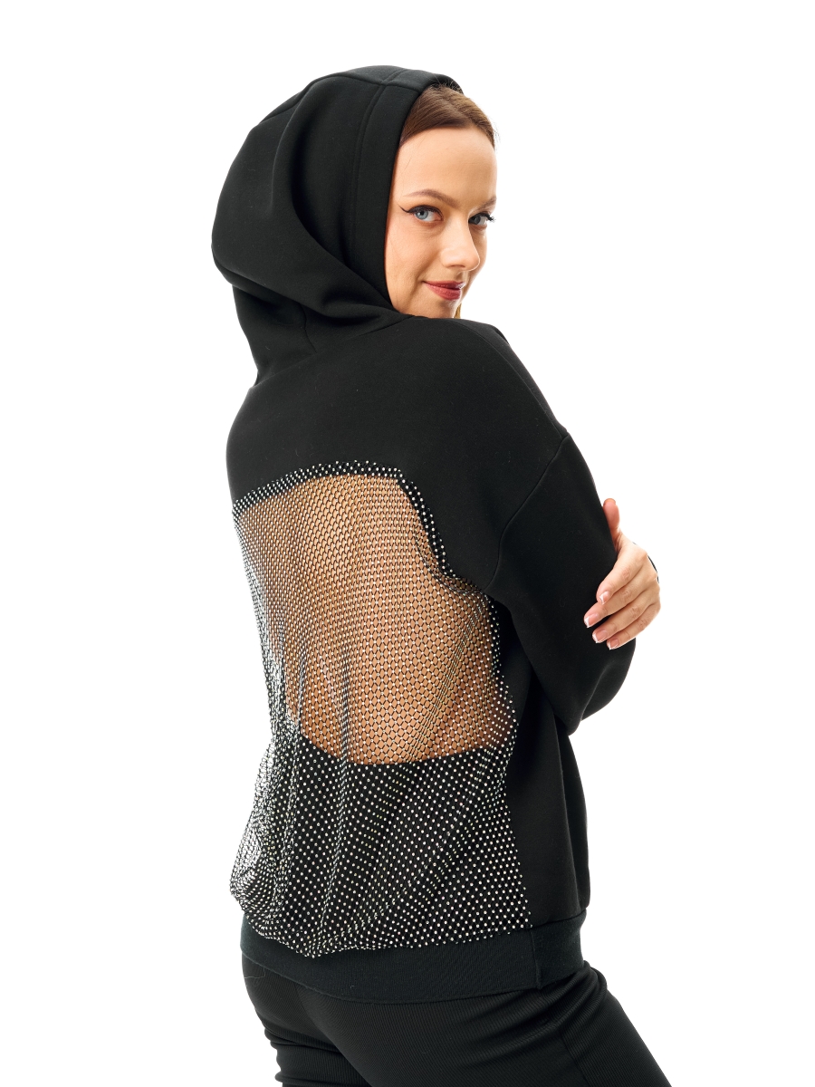 Сочетание нежности и дерзости в одной модели. Это не просто худи, а настоящий арт-объект для вашего гардероба. Мягкий и уютный крой спереди идеально контрастирует с соблазнительной спинкой, украшенной сеткой со стразами.