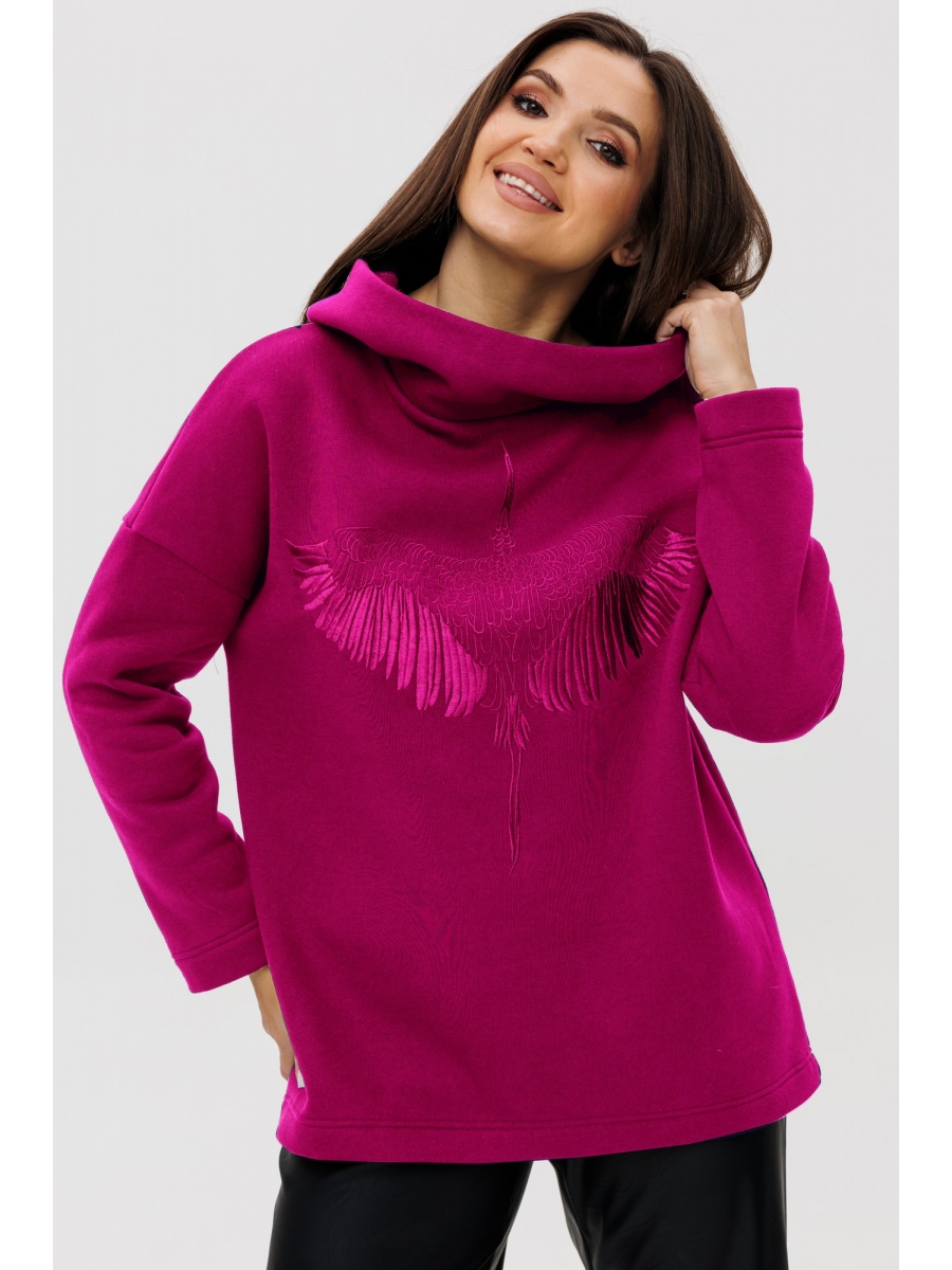 Стильный джемпер Ma Сhérie свободного силуэта в спортивном стиле, выполненный из теплого трикотажа с начесом. Джемпер с капюшоном. На груди выполнена дизайнерская вышивка "аист". Спинка цельная, низ фигурный. Длина спереди джемпера немного короче, чем по спинке. Рукав длинный одношовный втачной, линия плеча спущена.