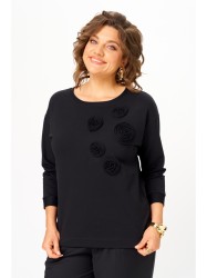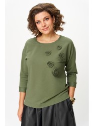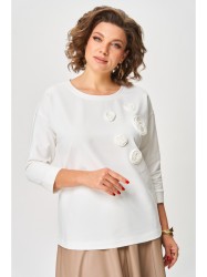 Джемпер женский из трикотажной хлопковой ткани (двунитка). По переду джемпера расположены декоративные элементы. Спущенное плечо, рукав 3/4. Низ рукава обработан манжетой. Вырез горловины круглый, оформлен бейкой.