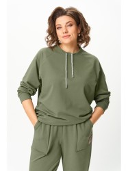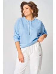 Джемпер женский из трикотажной хлопковой ткани (трехнитка). Рукав реглан. Низ рукава обработан притачной манжетой. Низ изделия оформлен притачным поясом. На спинке настрочен декоративный элемент. Вырез горловины круглый, обработан бейкой со шнуром.
