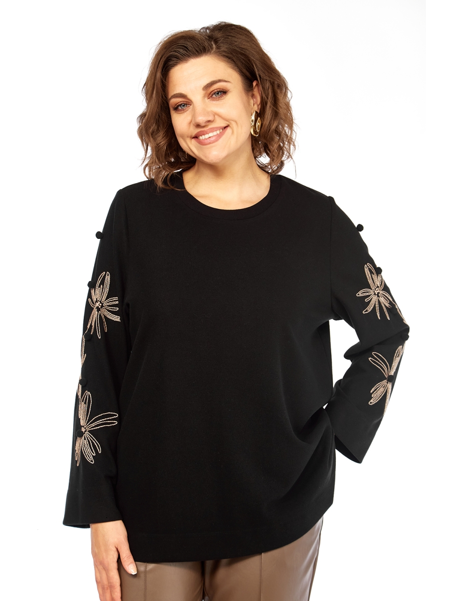 Джемпер женский, выполнен из трикотажного полотна. Перед и спинка цельнокроеные. Горловина круглой формы. Рукава втачные, декорированны вышивками и помпонами.