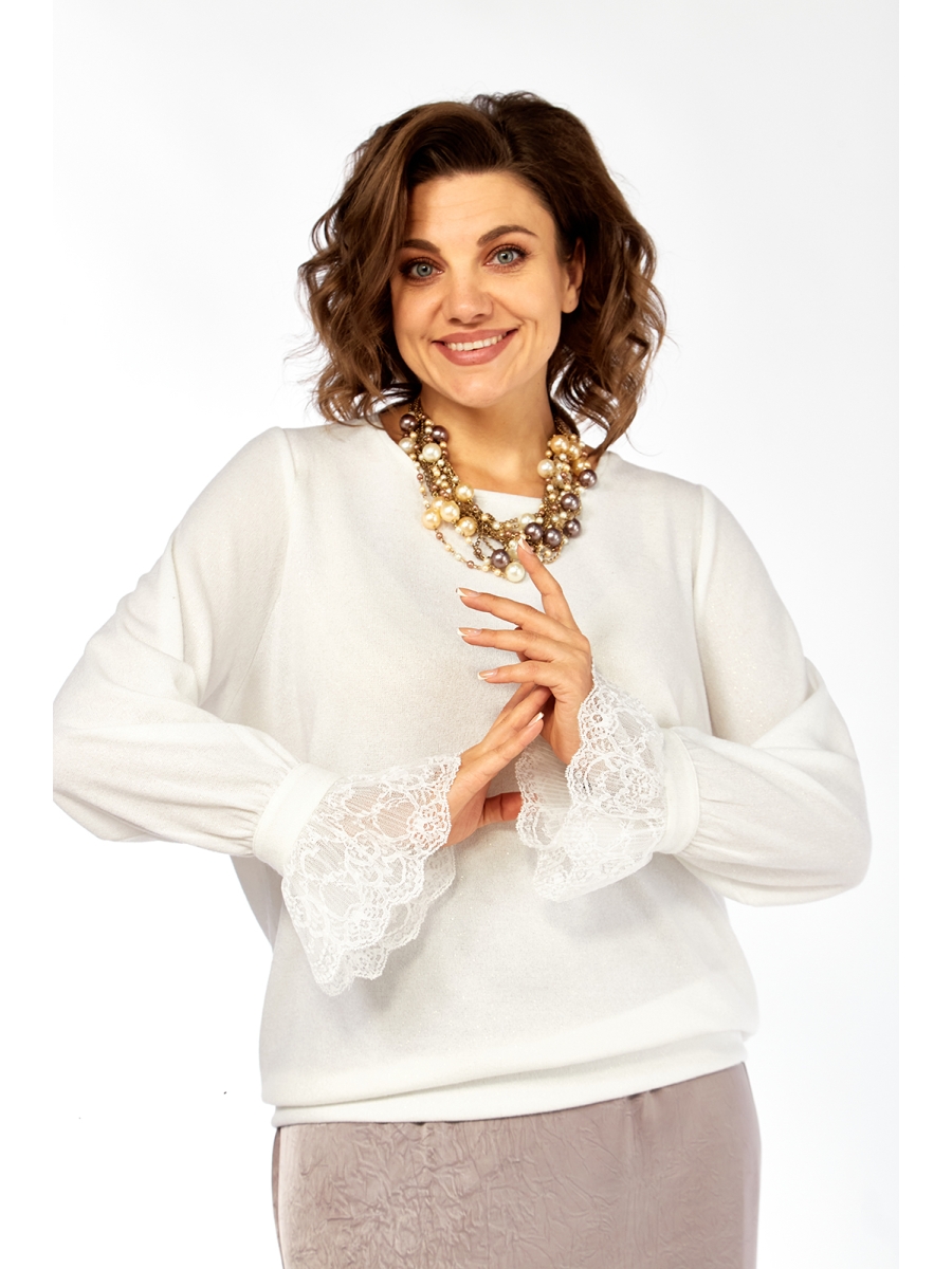 Джемпер женский, нарядный, выполнен из трикотажного полотна с искринкой. Перед и спинка цельнокроеные. Горловина круглой формы. Рукава втачные, по низу декоративные элементы с кружевом. Низ изделия с притачной деталью.