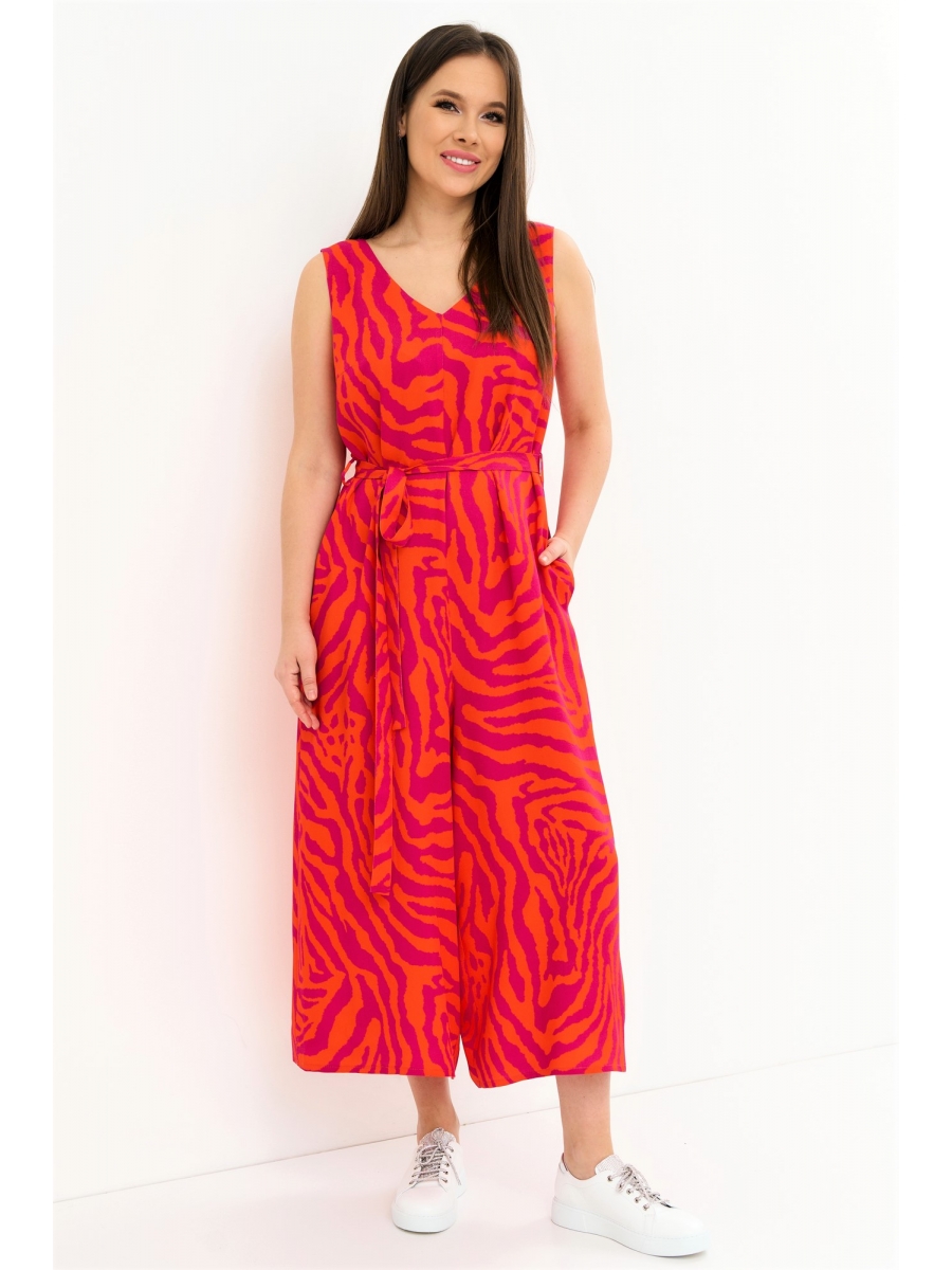 Стильный легкий комбинезон прямого силуэта длиной 7/8, без рукавов, с V-образным вырезом горловины. Дополнен удобными боковыми карманами. Притален съемным поясом, выполненным из основной ткани. Застежка комбинезона на молнию в среднем шве спинки.