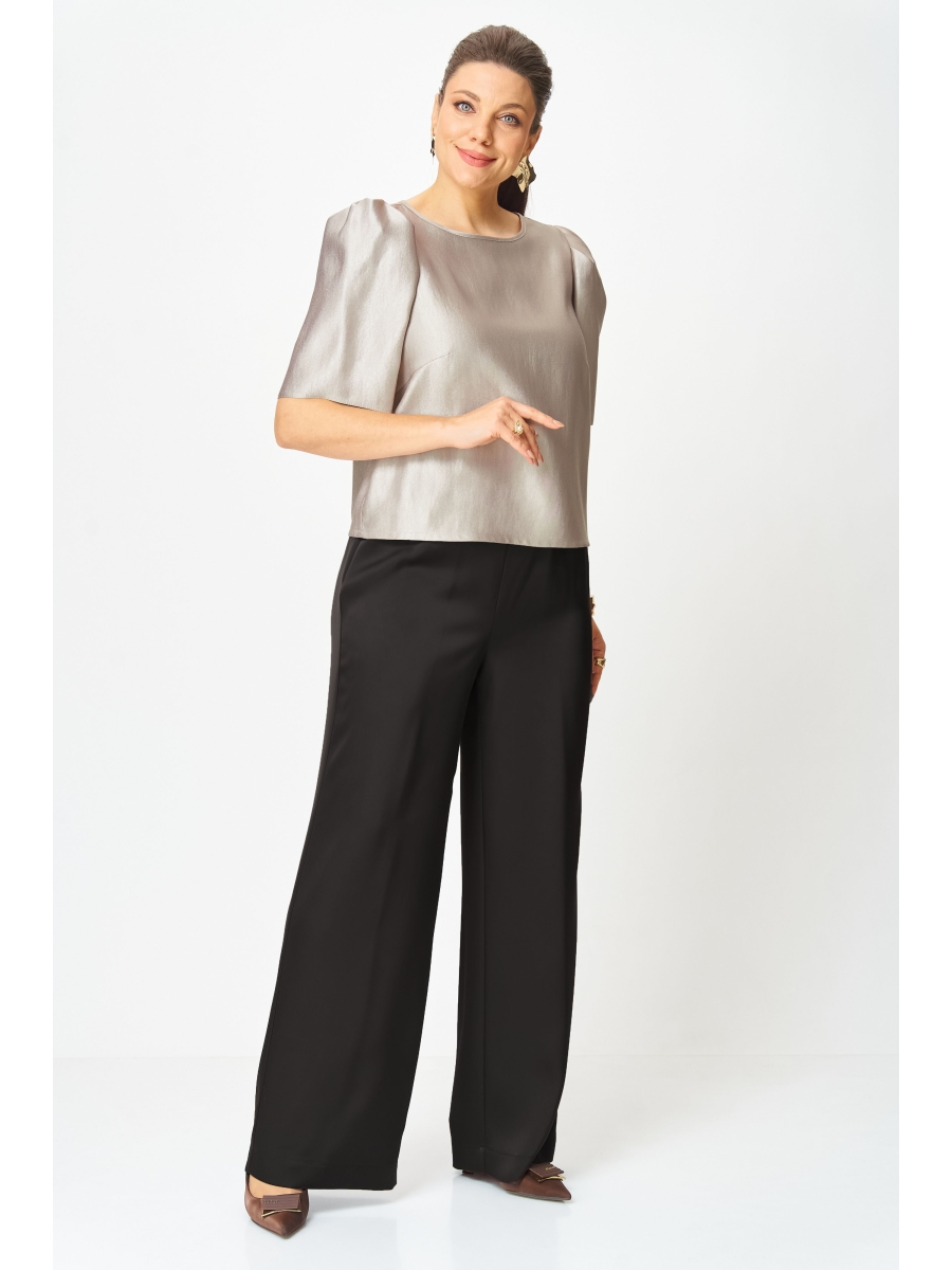 Блузка свободного силуэта из плательной ткани с блеском. Горловина круглая, по спинке в центральном шве разрез возле горловины с завязками. Рукава втачные с объемными складками по откату.