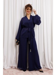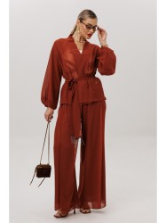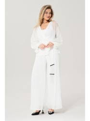 Элегантный вечерний костюм-двойка, состоящий из блузки свободного кроя и широких брюк.