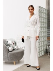 Этот костюм сочетает в себе элегантность и комфорт, что делает его подходящим как для деловых встреч или прогулок.