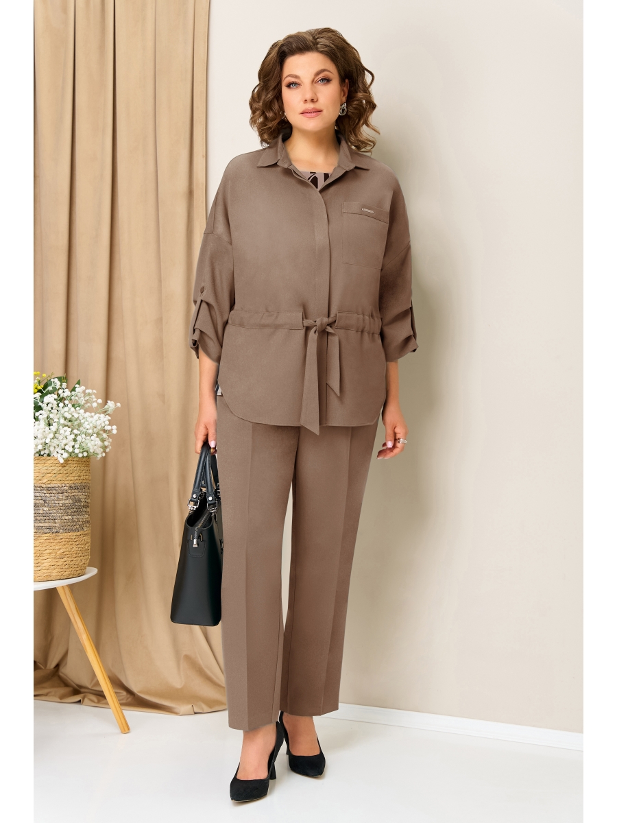 Жакет на потайной застежке, с пришивной кулисой и поясом, прямые классические брюки и блуза- универсальный комплект для различных вариантов носки. Элегантный рукав с патой на цельнокроеной основе.