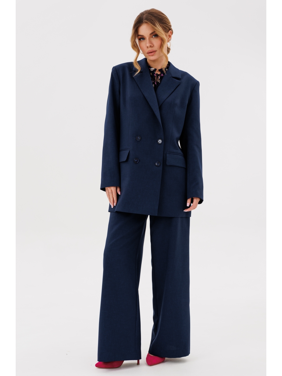 Жакет прямого силуэта. По переду нагрудная вытачка, переходящая в прорезной карман с клапаном. Двухбортная застёжка на петли-пуговицы. Рукав двухшовный. Спинка с фигурным рельефом и шлицей. Жакет на подкладке.