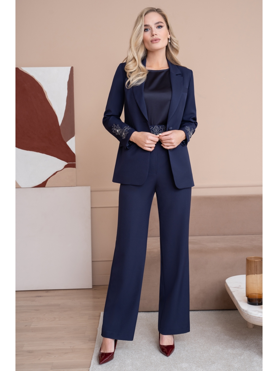 Костюм женский трёхпредметный состоит из удлиненного жакета полуприлегающего силуэта с вышивкой на рукаве, брюк и блузы.