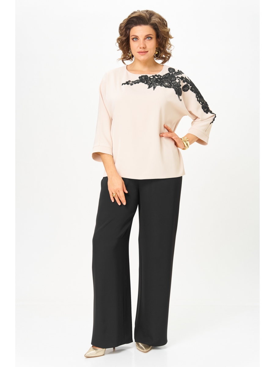 Блузка женская из текстильной ткани с цельнокроеным рукавом. Прямого силуэта. По переду блузки настрочена аппликация. По спинке расположен средний шов. Рукав 3/4, низ рукава с манжетой. Вырез горловины круглый, обработан обтачкой. Блузка застегивается на петлю-пуговицу.