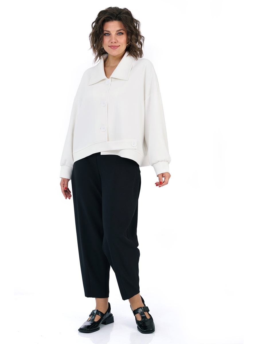 Жакет прямого, свободного силуэта, с застёжкой на петли, пуговицы, со спущенной линией плеча, с фигурной линией низа и притачным поясом. Рукава втачные, одношовные, длинные, понизу со сборкой, притачными манжетами. Воротник отложной.