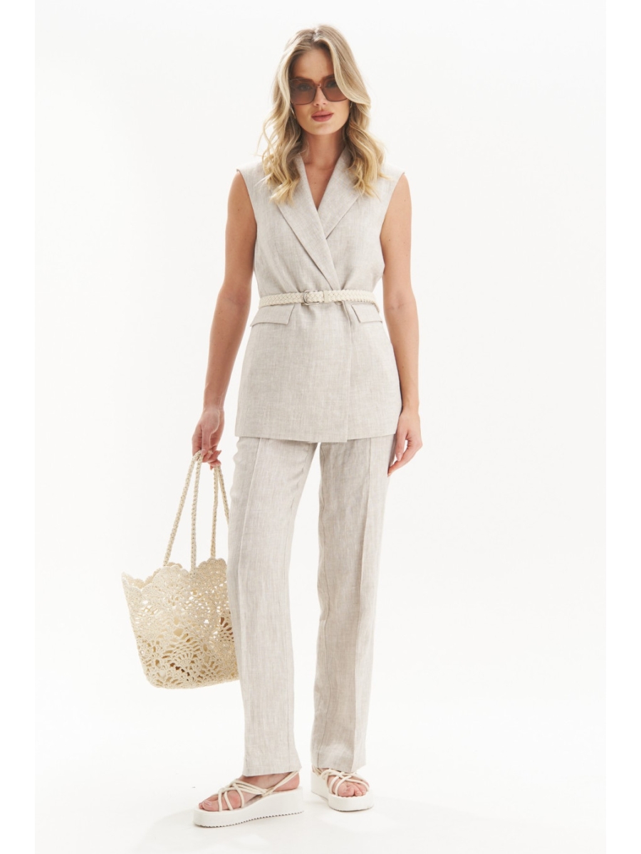 Костюм женский 2-х предметный, состоящий из жилета и брюк, выполненных из костюмно-плательной ткани лен, со съёмным декоративным поясом (размер и цвет фурнитуры может незначительно отличаться от фото), для повседневной носки.