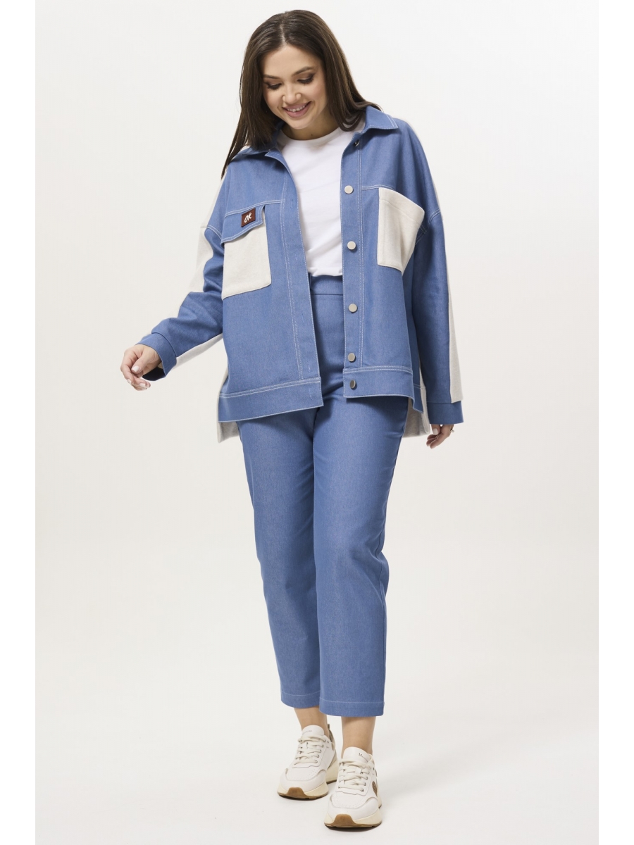 Полочка из джинсовой ткани, застежка на петли и пуговицы, выполнена на притачной планке. Воротник рубашечного типа. Полочка с кокеткой, ниже которой выполнены накладные карманы из трикотажной ткани. Снизу полочки идет притачная манжета. Рукав и цельная спинка из трикотажа крупной вязки. Рукав втачной, двухшовный, по низу рукава притачная манжета, линия плеча спущена. В жакете спинка немного длиннее полочки.