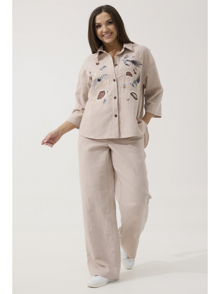 Рубашка свободного силуэта. Воротник отложной рубашечного типа. Застежка центральная на петли и пуговицы, спинка с кокеткой. На полочке расположены две симметричные дизайнерские вышивки. Рукав 3/4 со спущенной линией плеча, одношовный.