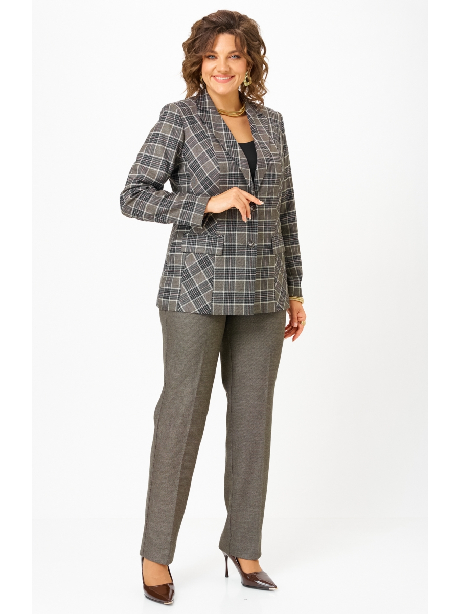 Жакет удлиненный, полуприлегающего силуэта с центральной бортовой застежкой на пуговицы до линии перегиба лацкана. Спереди рельефные швы от плечевого шва, отрезной бочок и карман с клапаном. Спинка с рельефами от плечевого шва. Рукав втачной, двухшовный. Воротник пиджачного типа. Жакет на подкладке.
