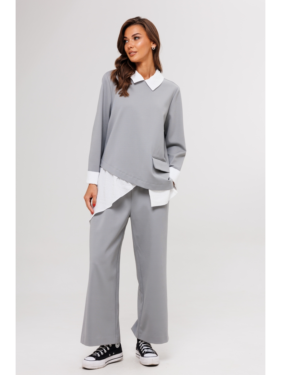 Верх: асимметричный джемпер с контрастным белым воротником и вставками, создающий эффект многослойности. Декоративный карман добавляет акцента.