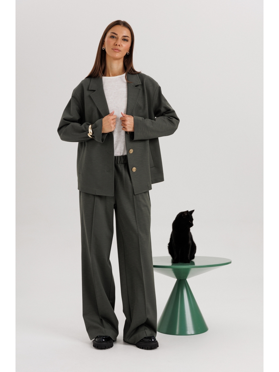 Универсальный глубокий оттенок ткани делает костюм практичным и актуальным в любое время года.