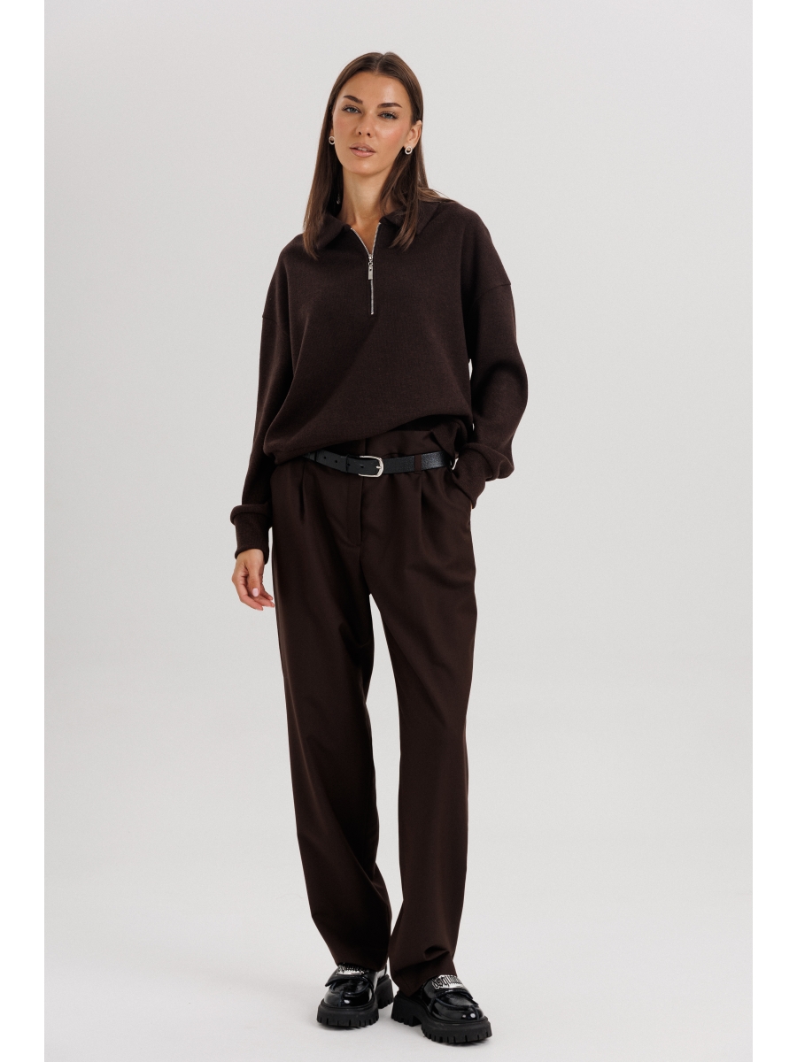 Джемпер из трикотажа. Это одна из базовых вещей осенне-зимнего сезона. Он тёплый, удобный и невероятно комфортный. К тому же, настолько универсален, что его можно стилизовать абсолютно разными способами. Свободный покрой с заниженной линией плеча, рукав рубашечного покроя на отрезной манжете, воротник классический, по центру полочки частичная застёжка-молния. По низу джемпера - отрезной пояс.
