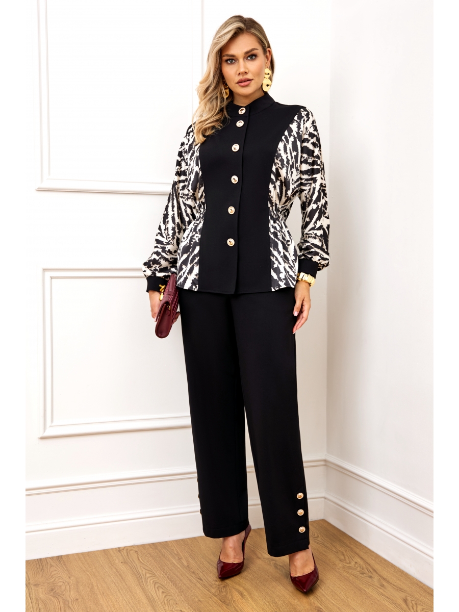 Блуза полуприлегающего силуэта, выполнена из высококачественной трикотажной ткани, рукав и бочек выполнены из атласной ткани с модным дизайнерским принтом. Блуза с горловиной стойкой и застёжкой по переду на пуговицы. Рукав полной длины, выполнен в стиле летучая мышь, с манжетой из однотонного трикотажа. На талии по бокам блуза с резинкой. Все элементы блузы создают неповторимый образ, модель невероятно стройнит.