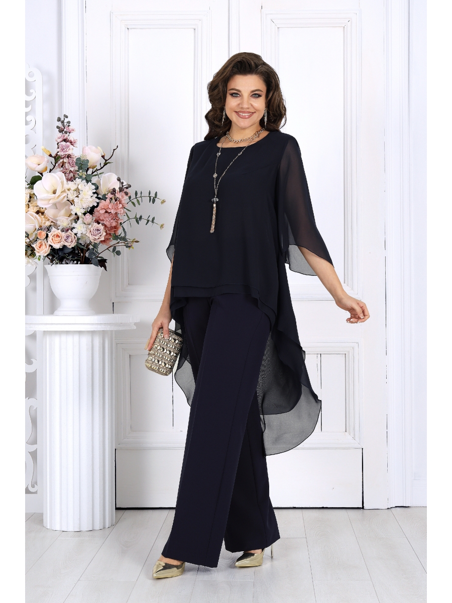 Элегантный брючный костюм – идеальный выбор для вечернего выхода, торжества или особого случая. Легкая шифоновая туника с асимметричным кроем и струящимися рукавами добавляет образу воздушности и утонченности. Удлиненная спинка делает силуэт элегантным и зрительно вытягивает фигуру. Прямые классические брюки из костюмной ткани великолепно садятся по
