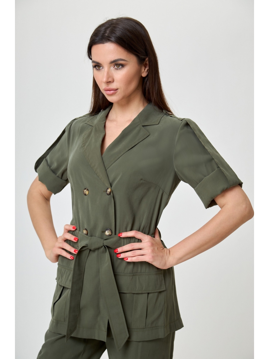 Брючный костюм в стиле сафари - это минималистичный образ с продуманными деталями кроя: двубортный жакет без подкладки свободного, спокойного силуэта с втачными длинными рукавами и патами для регулирования длины. Отложной воротник с бортами, накладные карманы с клапанами, в области талии эластичная лента с завязывающимся поясом.