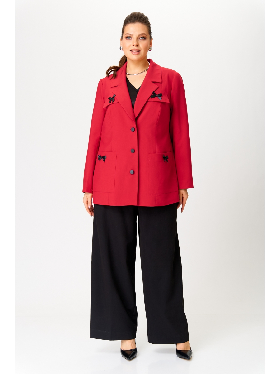 Жакет oversize, однобортный, прямого силуэта на контрастной подкладке. Отложной воротник с V-образным вырезом скроет несовершенства и визуально вытянет силуэт, сделает образ модным и стильным. Рукав втачной, двушовный, полномерный по обхвату. На полочках накладные карманы. На накладных карманах декоративные элементы - бантики контрастного цвета. Спинка с центральным швом.