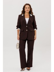 Жакет полуприлегающего силуэта, выполнен из костюмной ткани (не тянется) с отделкой из довяза на подкладке. Перед с нагрудными вытачками и настрочными клапанами. Застежка центральная на петли-пуговицы. Горловина оформлена воротником пиджачного типа с лацканом. Спинка со средним швом. Рукава втачные, двухшовные с мягкими складками и манжетой из довяза.