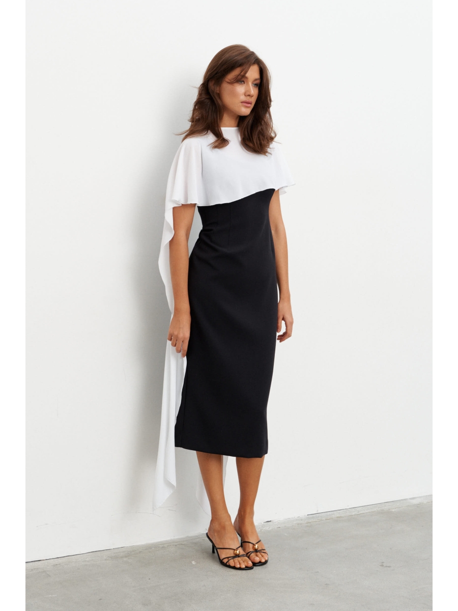 Комплект состоящий из плотного платья-футляра и струящейся, контрастной накидки.