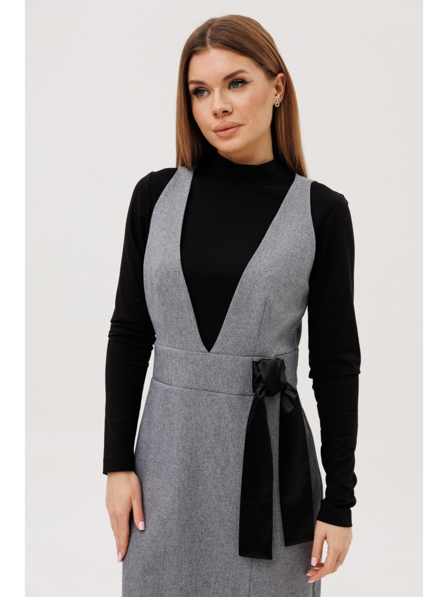 Сарафан женский прилегающего силуэта с V-образным вырезом, вытачками на лифе. На притачном поясе декоративный элемент (бант) из атласной черной ткани. По переду разрез. На спинке сарафана молния. Длина миди. Изделие на подкладке.