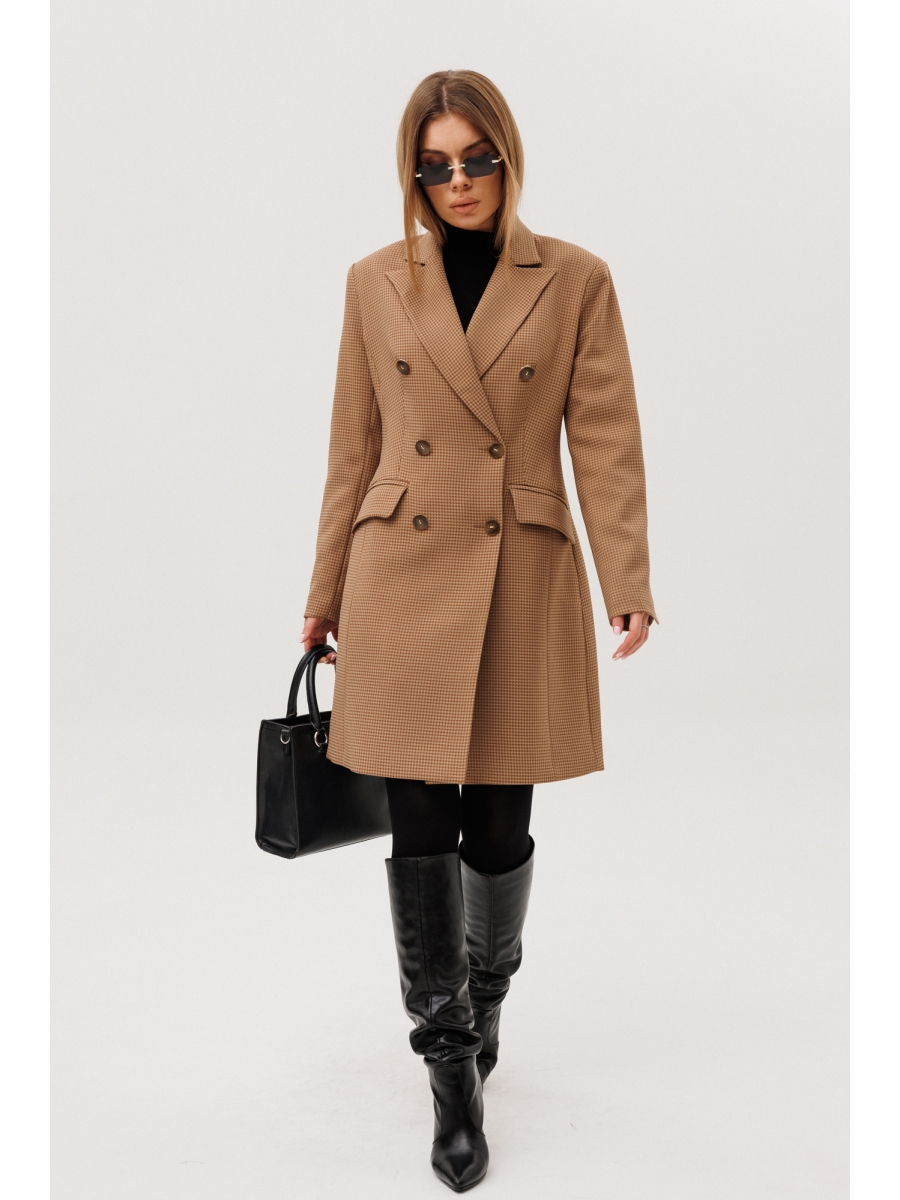 Платье-пиджак прилегающего силуэта, выполнен из теплой ткани. Застежка на петли-пуговицы, по переду действующие карманы, на рукавах шлицы. Изделие на подкладке.