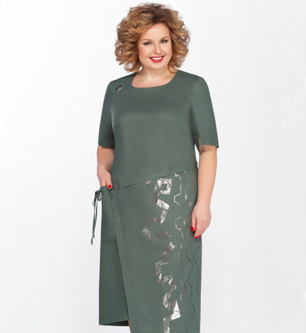 Платье полуприлегающего силуэта, выполнено из костюмно-плательной ткани. Модель на трикотажной подкладке, с плечевыми накладками. Перед и спинка с рельефными швами, направленными от проймы до низа. В верхней части среднего шва спинки обработана застежка на потайную тесьму-«молнию» (50см); в нижней части шва – шлица. Горловина округлой формы, спереди углубленная. Рукав втачной, короткий. Длина платья – 104 см; длина рукава – 25 см.