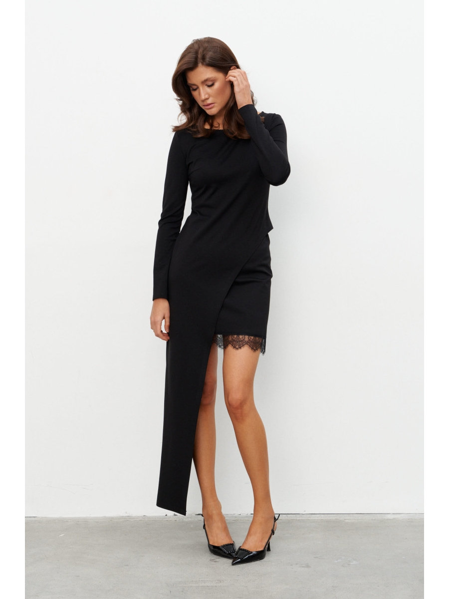Комплект имитирующие платье из трикотажного полотна состоящий из джемпера с асимметричным низом и мини-юбки с кружевом.