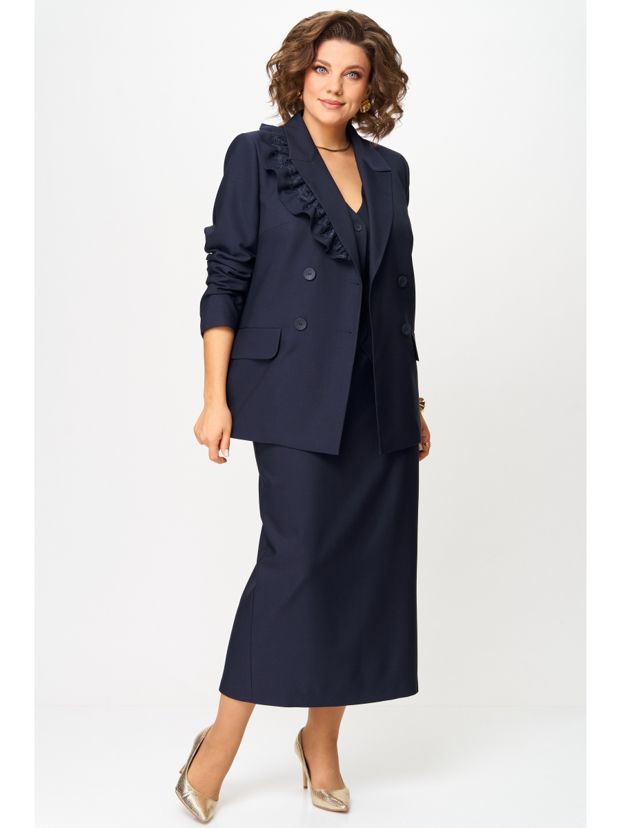 Жакет прямого силуэта, на подкладке, с плечевыми накладками. По переду — центральная двубортная застежка на петли и пуговицы, нагрудные вытачки и функциональные прорезные карманы с клапаном. Полочку жакета украшает съемная (на пуговицах) декоративная рюша с кружевом. Спинка со средним швом. Рукав втачной длинный двухшовный, с имитацией шлицы, декорированной пуговицами.