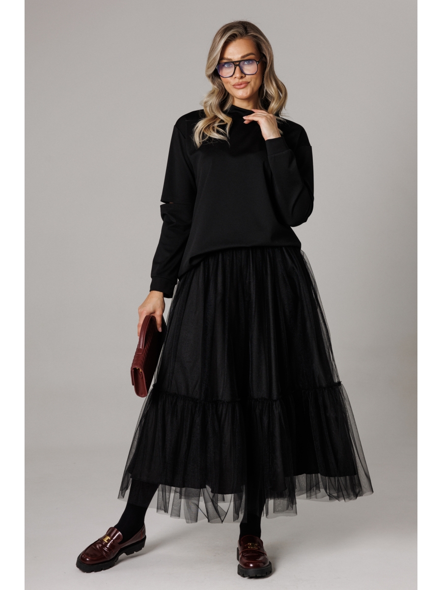 Юбка макси из 2-х видов ткани: верх с отрезным воланом из фатина, подкладка юбка солнце из шифона. Пояс на декоративной резинке. Фасон универсален, а использование резинки на поясе повышает комфортность носки, позволяя юбке адаптироваться под индивидуальные особенности фигуры. Юбку легко сочетать с различными верхами: топ, блузка, футболка, кружевной жакет, свитер или жакет из текстиля - все это позволит создавать различные образы на разные случаи.
