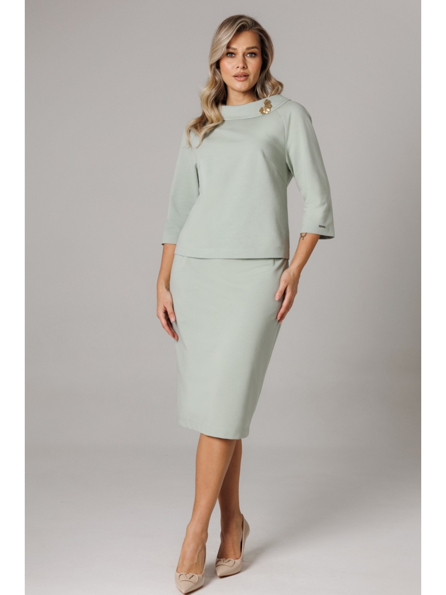 Блузка без застежки с воротником шалевой формы - это не только функциональный, но и стильный женственный акцент в образе. Длина рукава в блузке plus size 3/4 делает костюм универсальным.