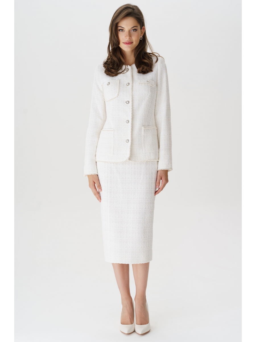 Костюм женский из костюмно-плательной ткани типа Chanel, состоит из жакет полуприлегающего силуэта на подкладке, и юбки-карандаш на подкладке.