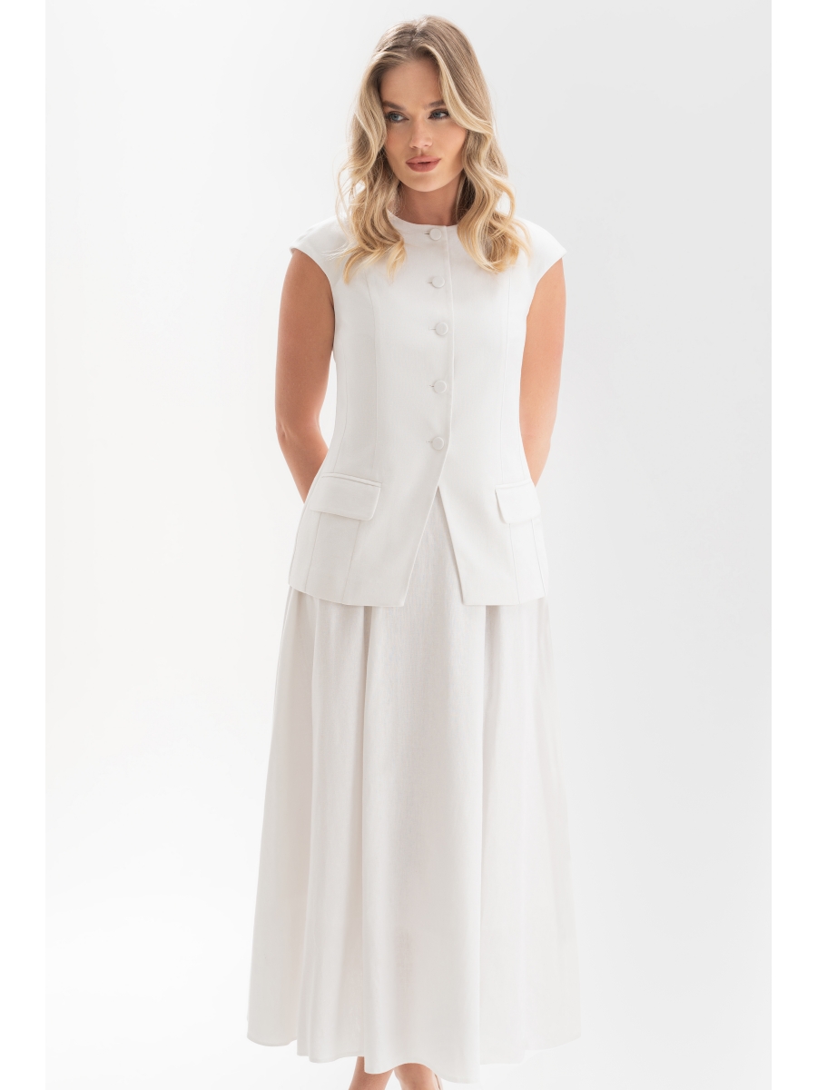 Костюм женский 2-х предметный, состоящий из жилета и юбки выполненных из костюмно-плательной ткани лен, предназначен как для нарядной, так и для повседневной носки.