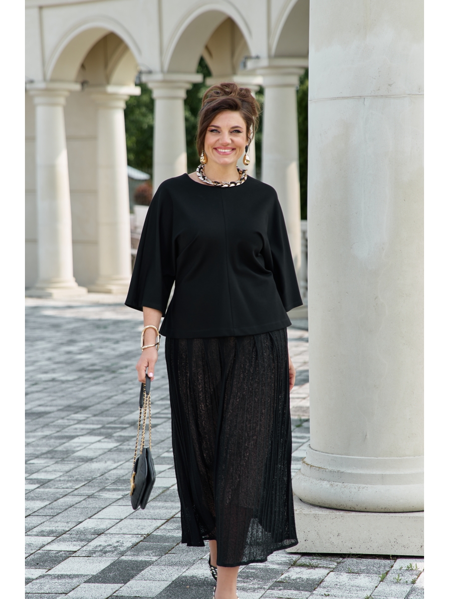 Юбка трапециевидного силуэта, из плиссированного полупрозрачного трикотажа. Плотные, чёткие складки расходятся веером, играя с ритмом шага. Пояс в юбке притачной со вставкой эластичной тесьмы резинки в задней части пояса. Застёжка на потайную тесьму-молнию в боковом шве и пуговицу в поясе. Юбка с отрезной кокеткой из отделочной ткани и заложенными складками от подреза. Юбка на подкладке.