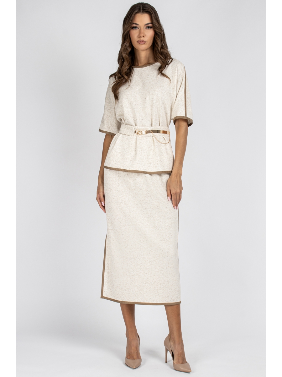 Костюм женский изготовлен из трикотажного полотна, состоит из блузона и юбки.