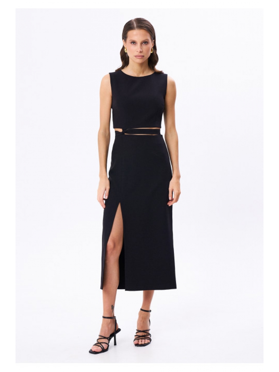Юбка длины миди слегка разведена книзу трапецией. В рельефе по переду разрез. В боковом шве потайная молния.