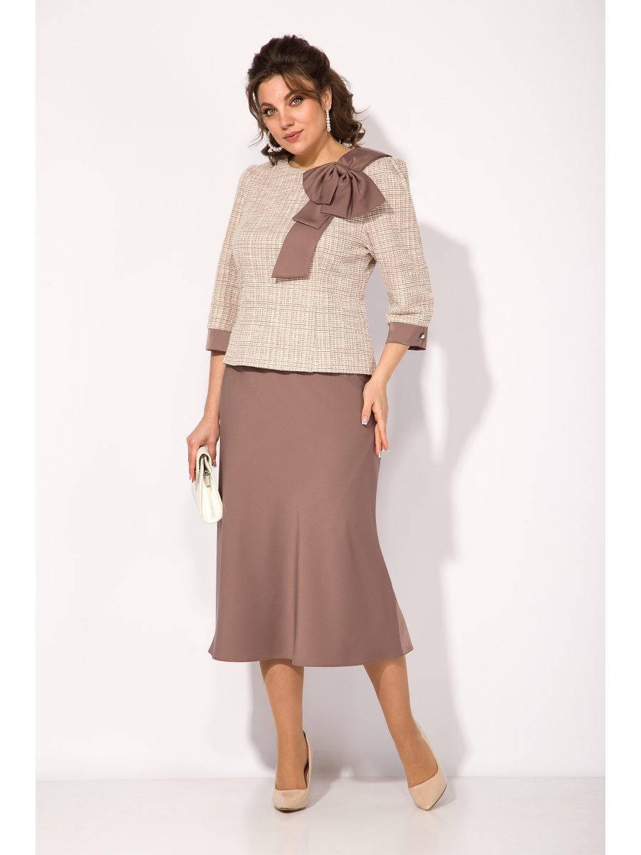 Блузон полуприталенного силуэта, выполнен из фактурного трикотажа. Рукав вточноу, по низу на манжете из отделочной ткани на декоративную пуговку. Полочка с продольными рельефами, декорирована эффектным атласным бантом. Спинка с центральным швом и застежкой на тесьму-молнию.
