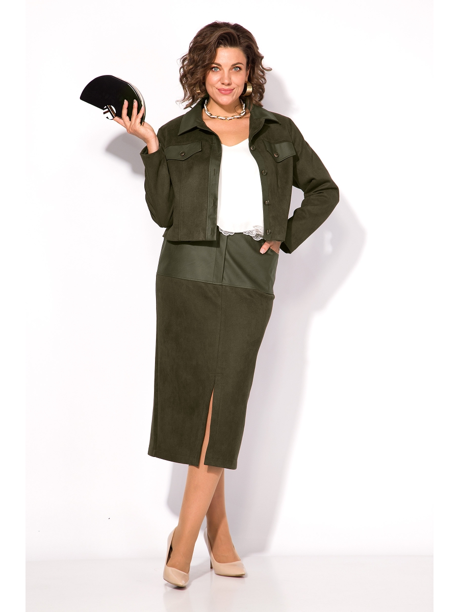Невероятно мягкий, уютный комплект из замшевого материала в составе жакета на пуговицах и юбки карандаш с разрезом по переду.