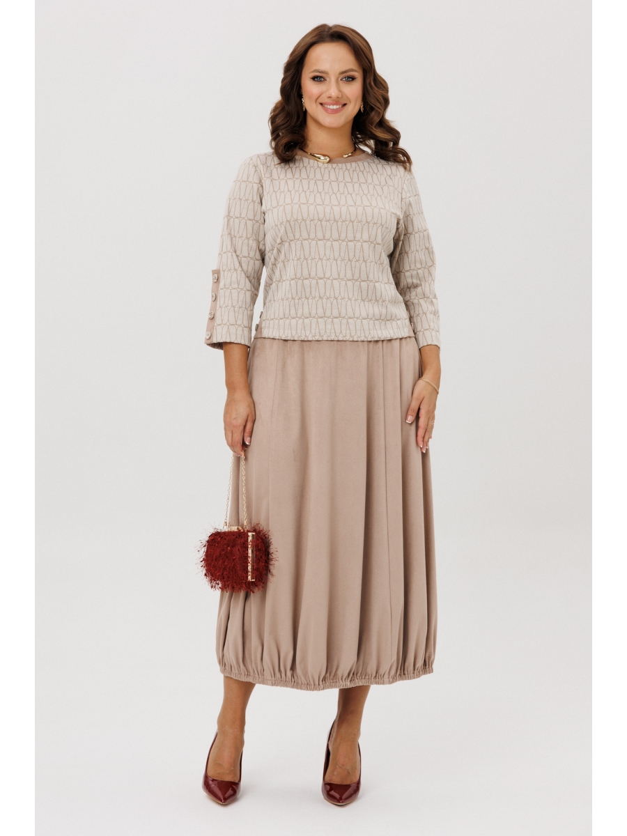 Юбка-баллон без подкладки, выполнена из костюмно-плательной ткани «Замша» (тянется). По переднему и заднему полотнищу вертикальные швы. В боковых швах функциональные карманы. Верхний срез оформлен поясом с эластичной резинкой. Нижний срез – собран резинкой.