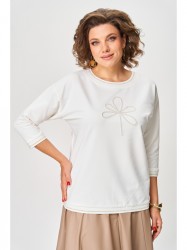 Джемпер женский из трикотажной хлопковой ткани (двунитка). По переду футболки расположен декоративный элемент из тесьмы. Спущенное плечо. Низ рукава, низ изделия и вырез горловины обработаны отделочной тесьмой. Спинка без среднего шва.