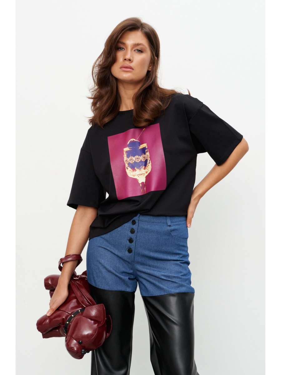 Оверсайз футболка из плотного трикотажа с ярким принтом «бокал». Линия плеча спущена, горловина отделана эластичной бейкой.