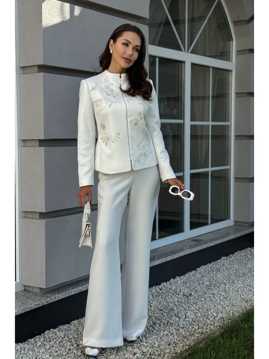 Жакет женский нарядный, полуприлегающего силуэта, выполнен из мягкой искусственной замши на трикотажной основе, с центральной бортовой застежкой ""встык"" с разъемной потайной молнией. Молния расположена на расстоянии 5,0 см от низа и заканчивается у воротника-стойки. Жакет на подкладке. Перед и спинка оформлены художественной вышивкой. Перед со смещенными рельефными швами, идущими из пройм до низа, с нагрудными вытачками от рельефов. Спинка с рельефными швами, идущими из пройм до низа и средним швом. Горловина оформлена воротником-стойкой. Рукава втачные, двухшовные, длинные, по низу локтевых швов с отлетными шлицами.